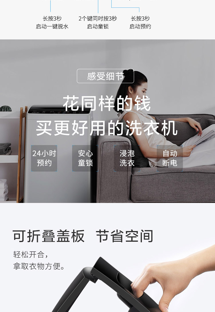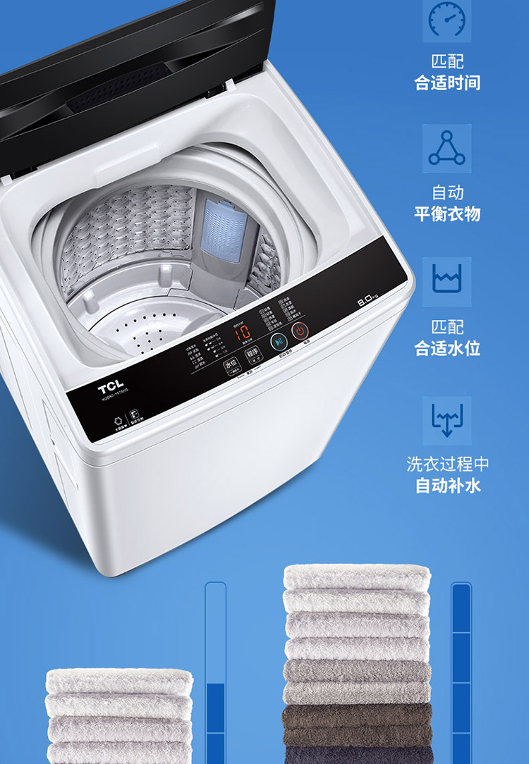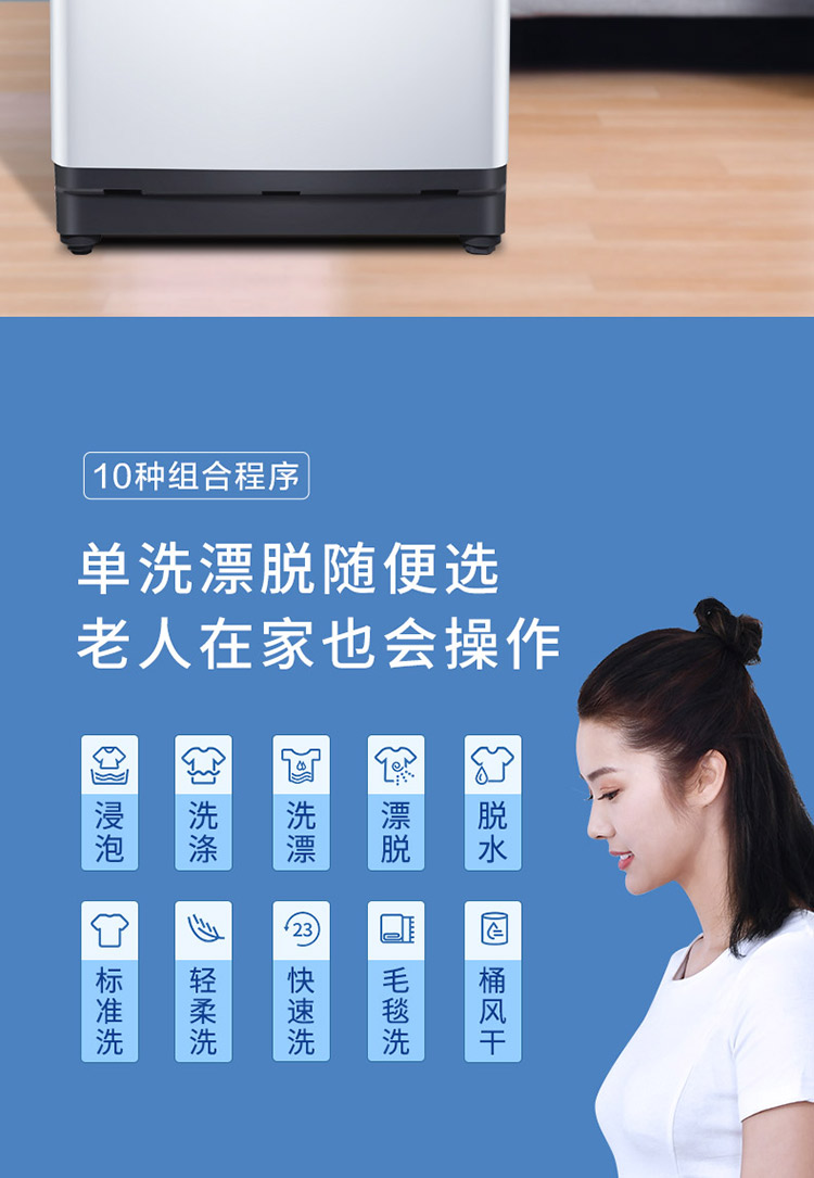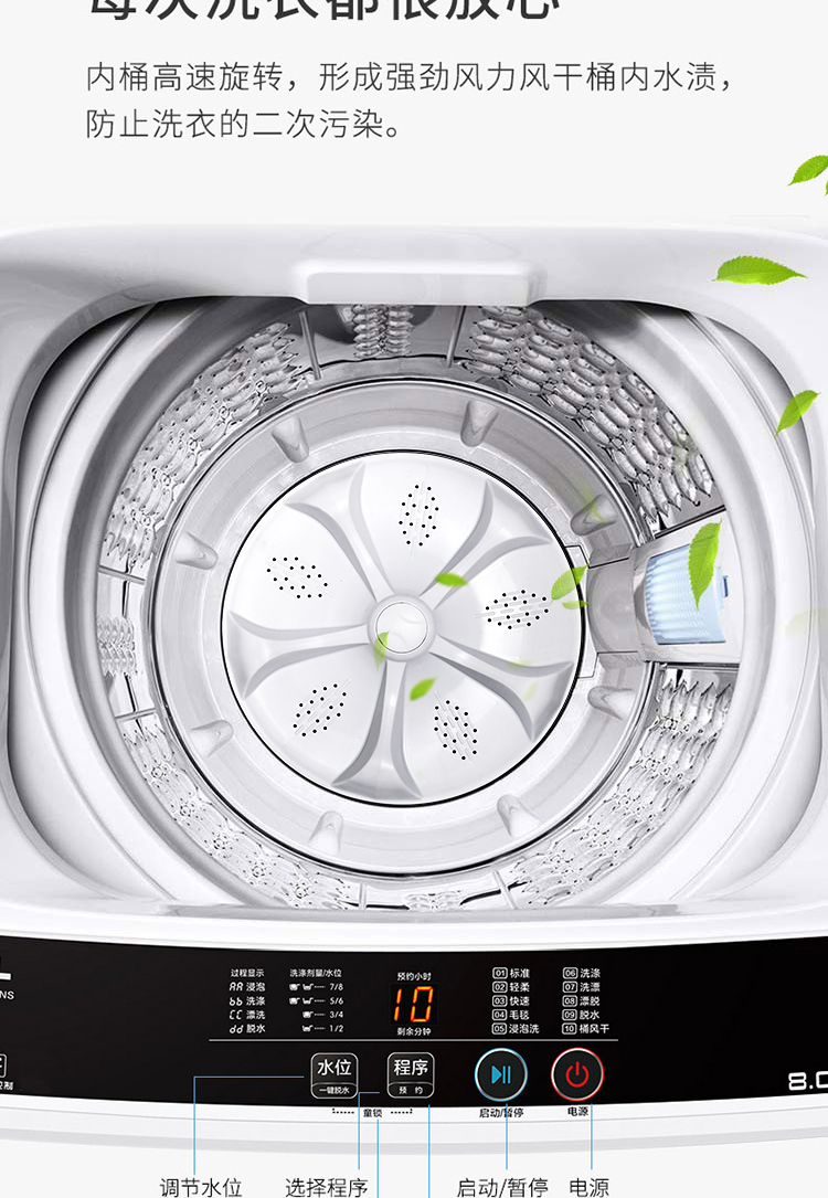 | 洗涤程序 | 模糊控制、轻触按键、8档电子水位、24小时预约、10程序(标准、轻柔、快速、毛毯、浸泡洗、洗涤、洗漂、漂脱、脱水、桶风干) |