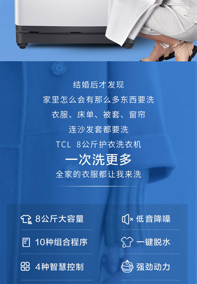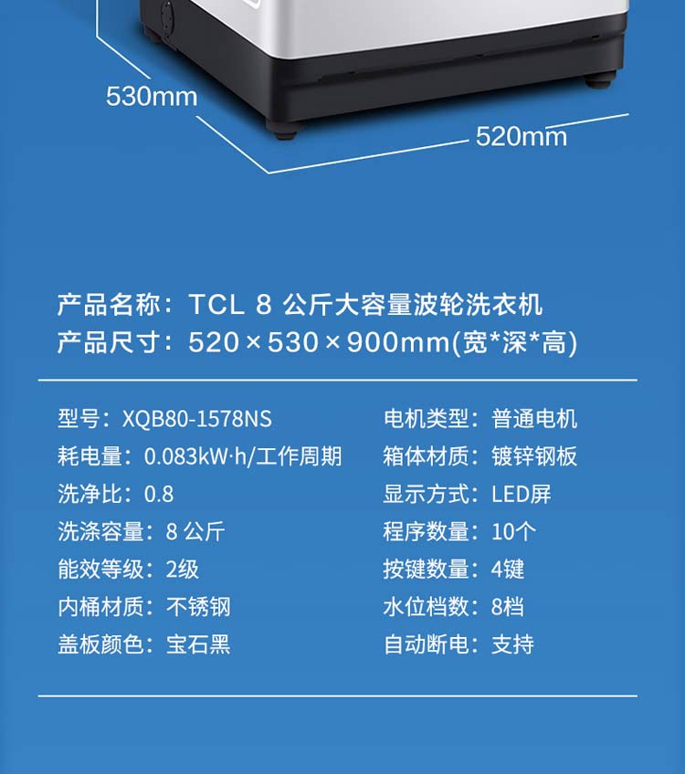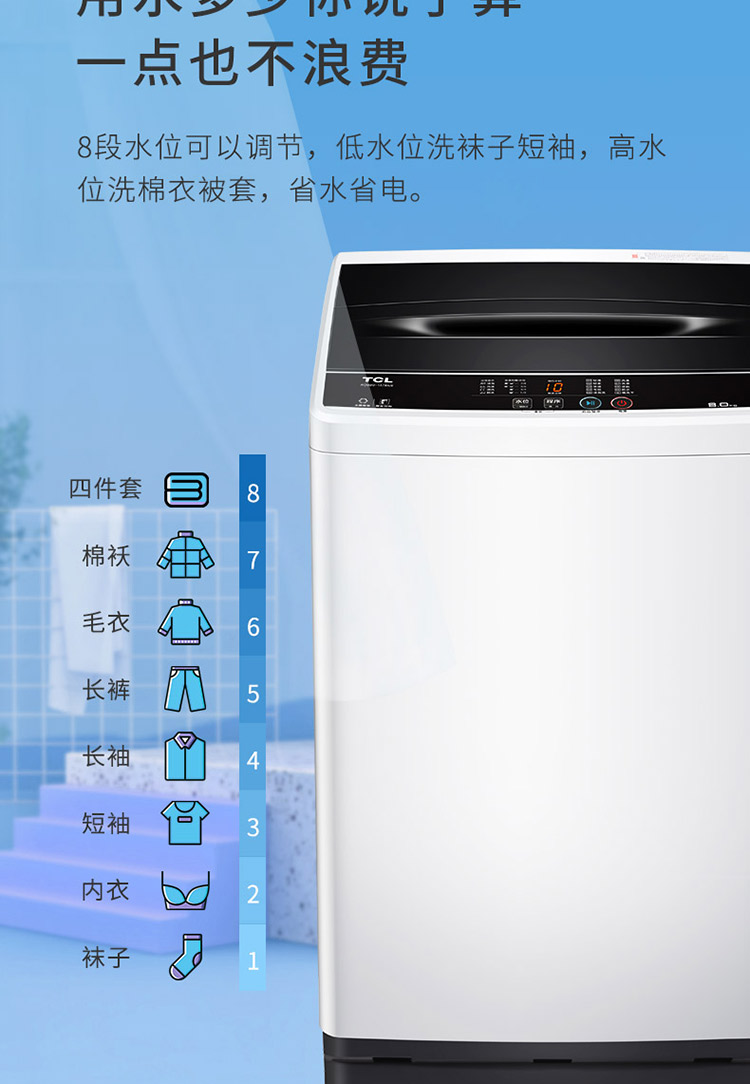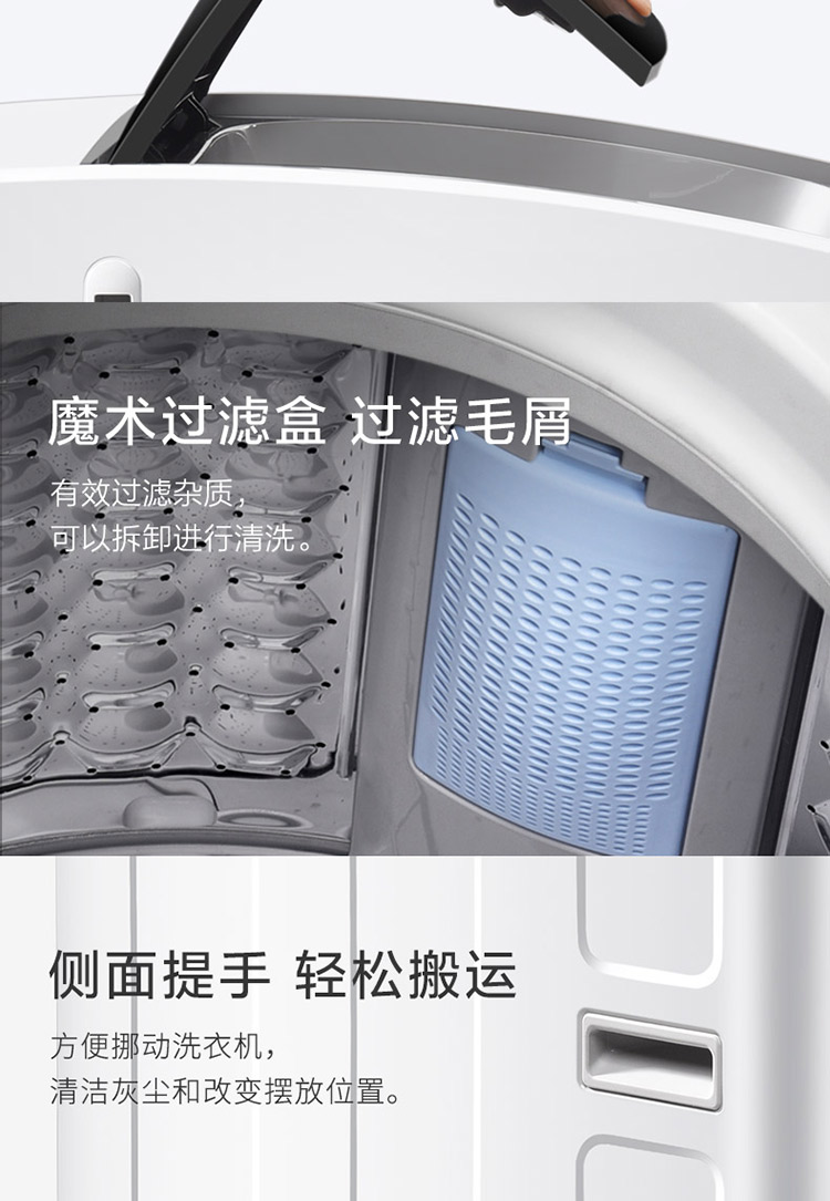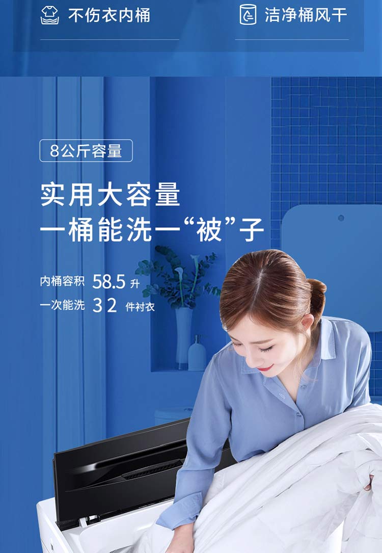| 洗涤程序 | 模糊控制、轻触按键、8档电子水位、24小时预约、10程序(标准、轻柔、快速、毛毯、浸泡洗、洗涤、洗漂、漂脱、脱水、桶风干) |