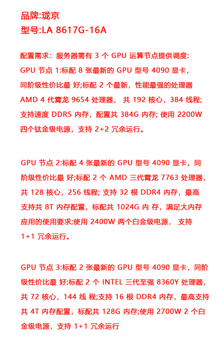 珑京 LA 8617G-16A 3GPU 节点服务器(2*AMD 9654/12*64G RECC DDR5 4800/3.84T SSD/RTX4090 24G*8/2200W*4/无阵列卡/Unbunt/三年保)