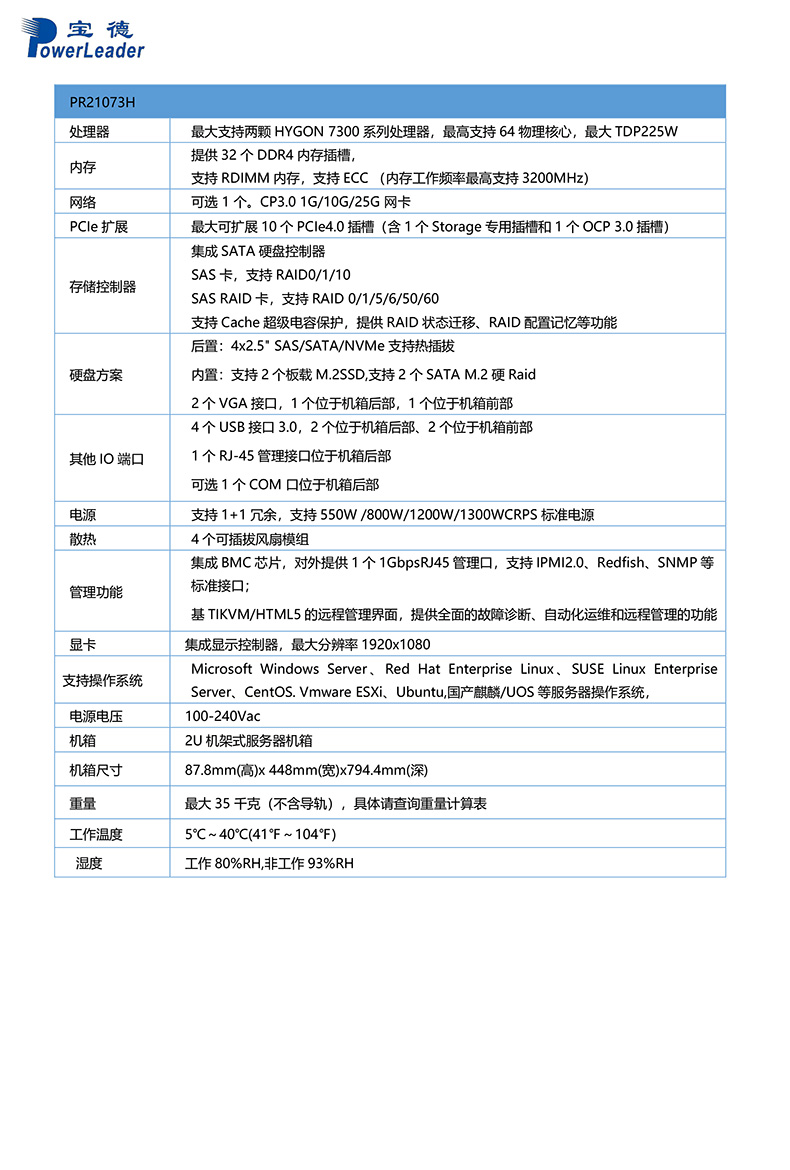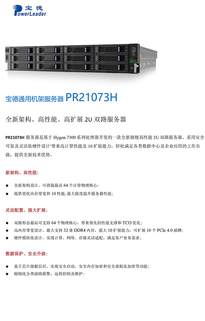 PR21073H服务器是基于Hygon 7300系列处理器开发的一款全新旗舰高性能2U双路服务器。采用安全可靠及灵活软硬件设计’带来高计算性能及10扩展能力,轻松满足各类数据中心及企业应用的工作负载,提供全新技术优势。广泛应用于云计算、数据库支撑硬件和数据容灾管理等应用场景。