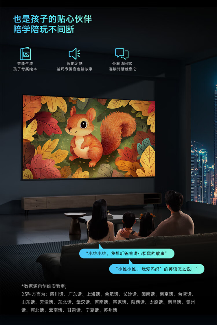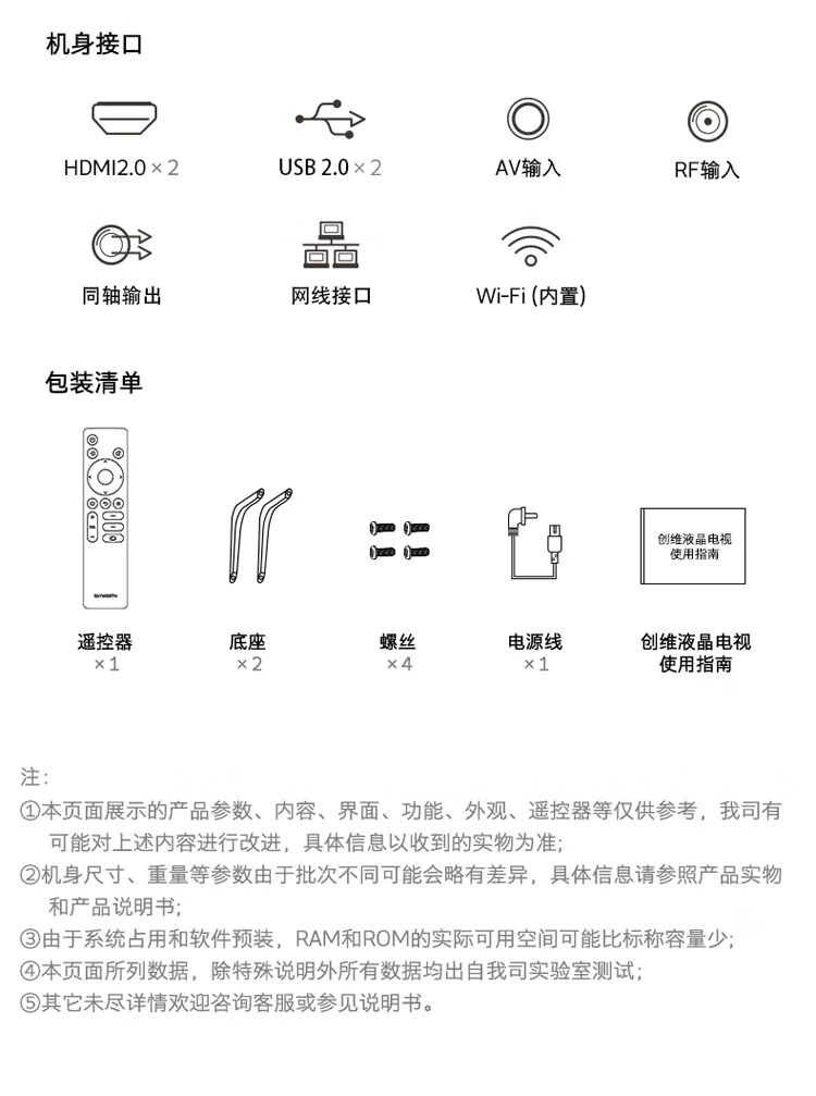 包装箱标配: 1)整机 × 1; 2)底座 × 2 3)底座螺丝 × 8 4)智慧屏蓝牙语音遥控器 × 1 5)电源线 × 1 6)取机警示说明 × 1 7)产品入门手册 × 1 8)保修卡 × 1 9)7号电池 × 2 10)AV转接线 × 1 11) 12M磁吸摄像头 × 1