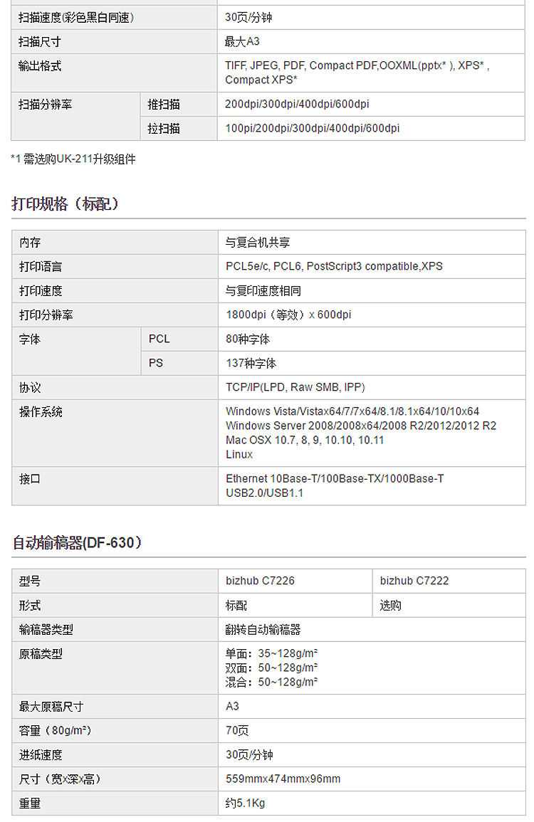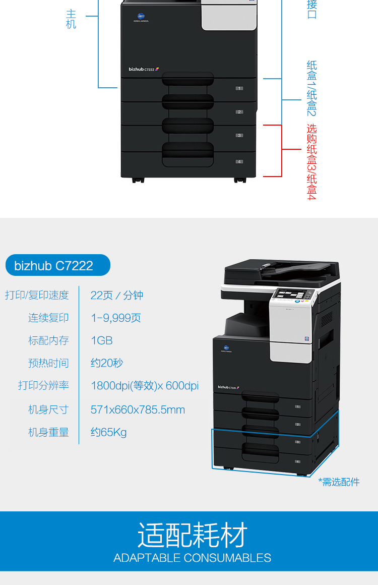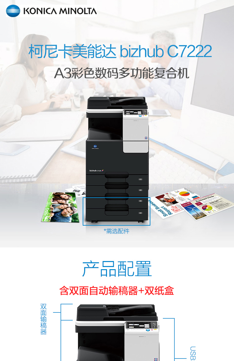 柯尼卡美能达 A3彩色复印机bizhubC7222(主机+双面自动输稿器+双纸盒+工作台-3年上门服务)